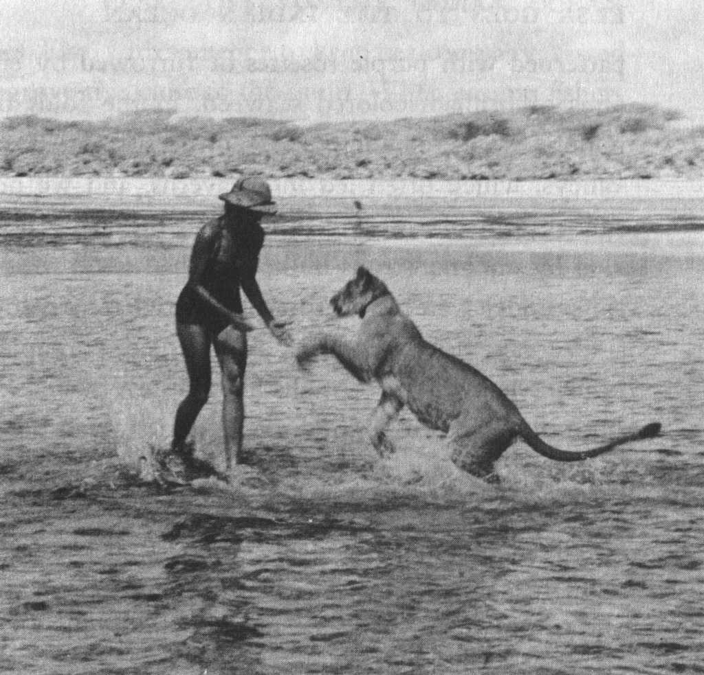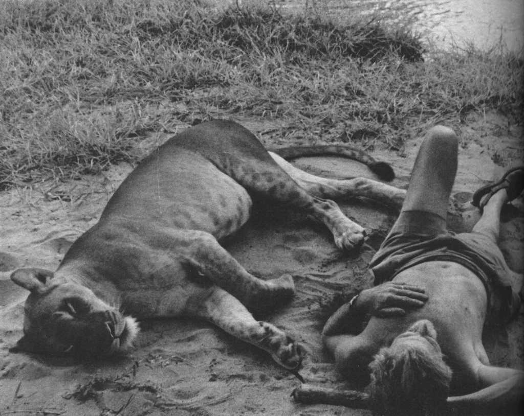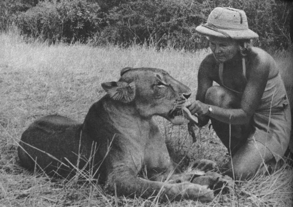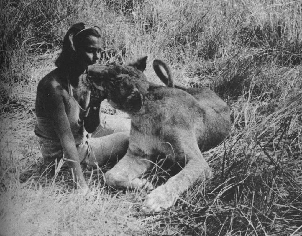Joy Adamson and the three female cubs (seven weeks old): The 'Big One', Lustica and Elsa |