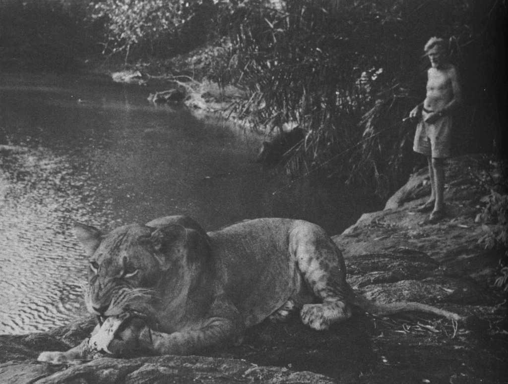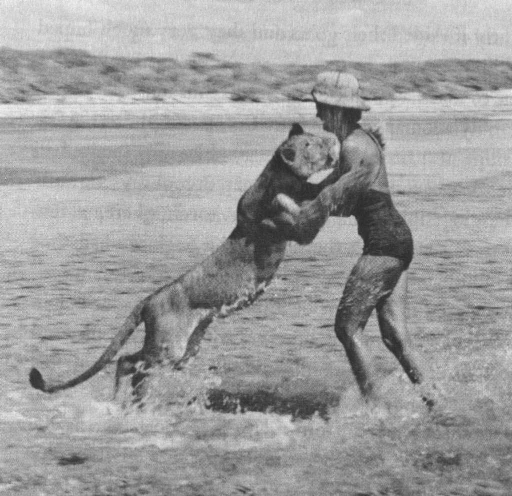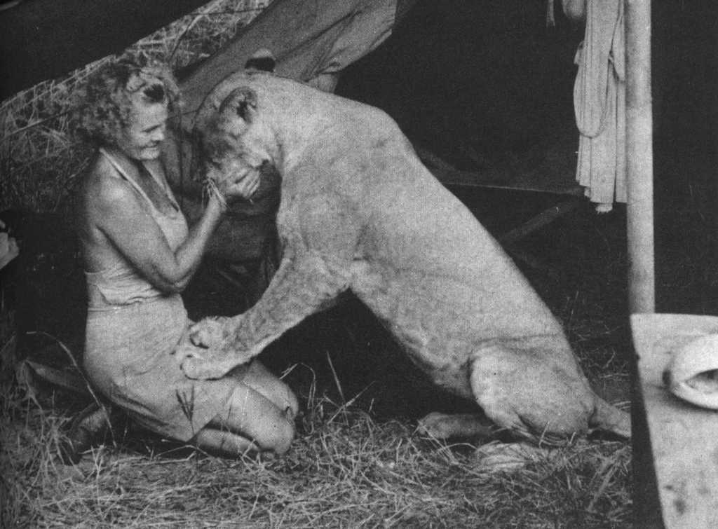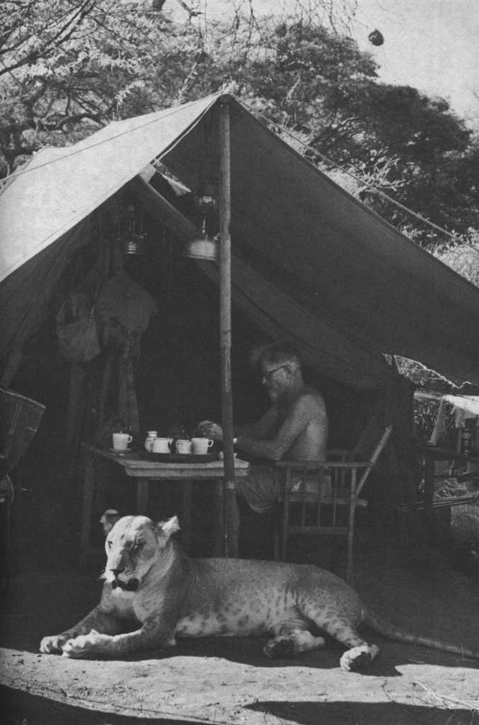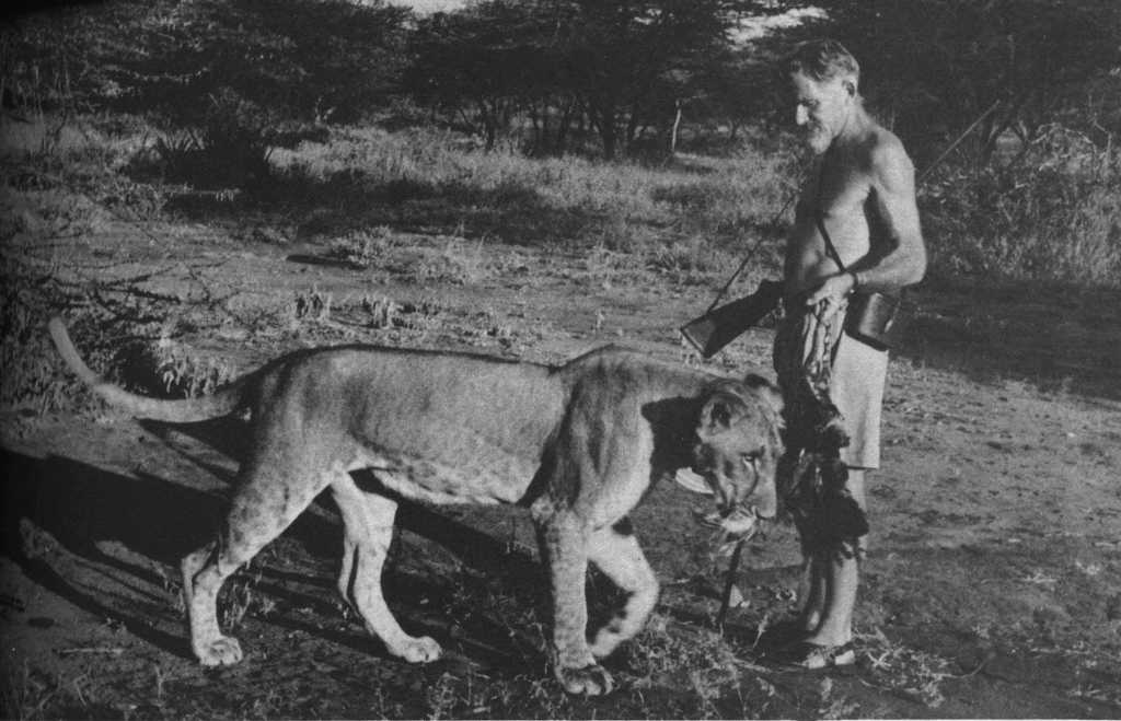 Joy Adamson and the three female cubs (seven weeks old): The 'Big One', Lustica and Elsa |